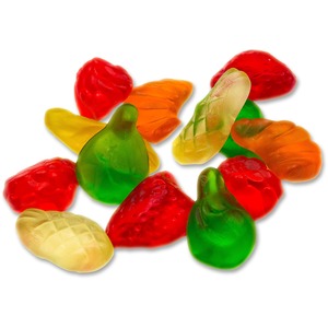 Enjoy flavor-filled gummies shaped like a fruit salad for a fun treat. Colorful gummies come in yellow, red, orange and green and are shaped and textured to resemble the fruits that match their flavors.